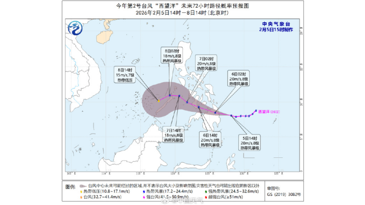 此前,今年第2號颱風「西望洋」(熱帶風暴級;英文名稱:Penha;名字來源:中國澳門;名稱意義:西望洋山,澳門新八景之一)在2月4日20時在菲律賓以東洋面生成。