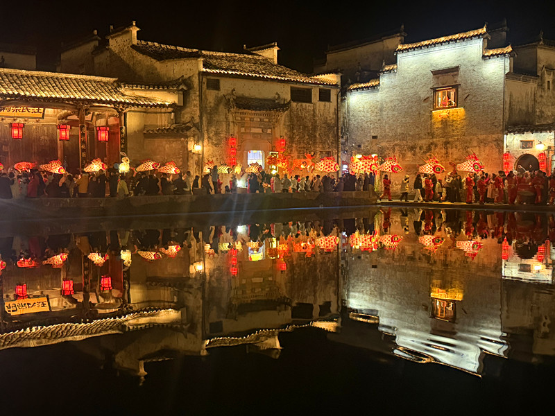 來自江蘇南通的遊客張潔說:「宏村的徽式建築很有韻味,古居民的牆上還掛着紅燈籠、臘肉,晚上還有花燈表演。雖然現在年還沒有到,但是氛圍已經深深地感受到了。這邊風景特別好,月沼、南湖等一些景點都非常適合打開拍照,特別好看。」