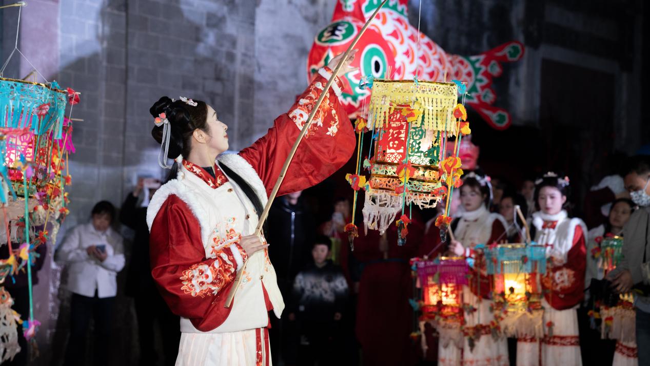 為讓非遺表達更貼近年輕脈搏,活動在多處歷史空間嵌入情境式演繹。東瑜閣下,「古閣映燈·徽風長存」以光影講述徽派古建與年俗燈火的故事;核心街道上,「長街燈河·儺舞驚鴻」以儺舞古朴身韻點睛現代街景;洪家大屋前,「宅院祈光·共慶新年」於古宅天井上演溫馨祈福場景。游客移步換景,不經意間與歷史撞個滿懷。