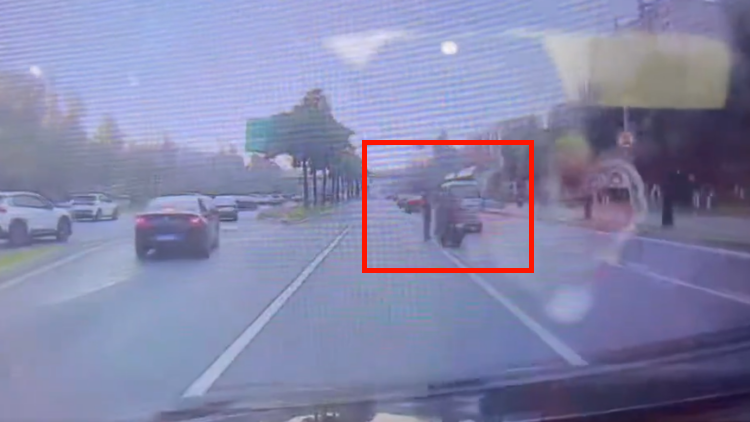 網絡視頻可見,邱某與交警發生碰撞。交警騰空後摔在地面,頭盔飛出;邱某也連人帶車側翻,倒地滑行。(網絡視頻截圖)