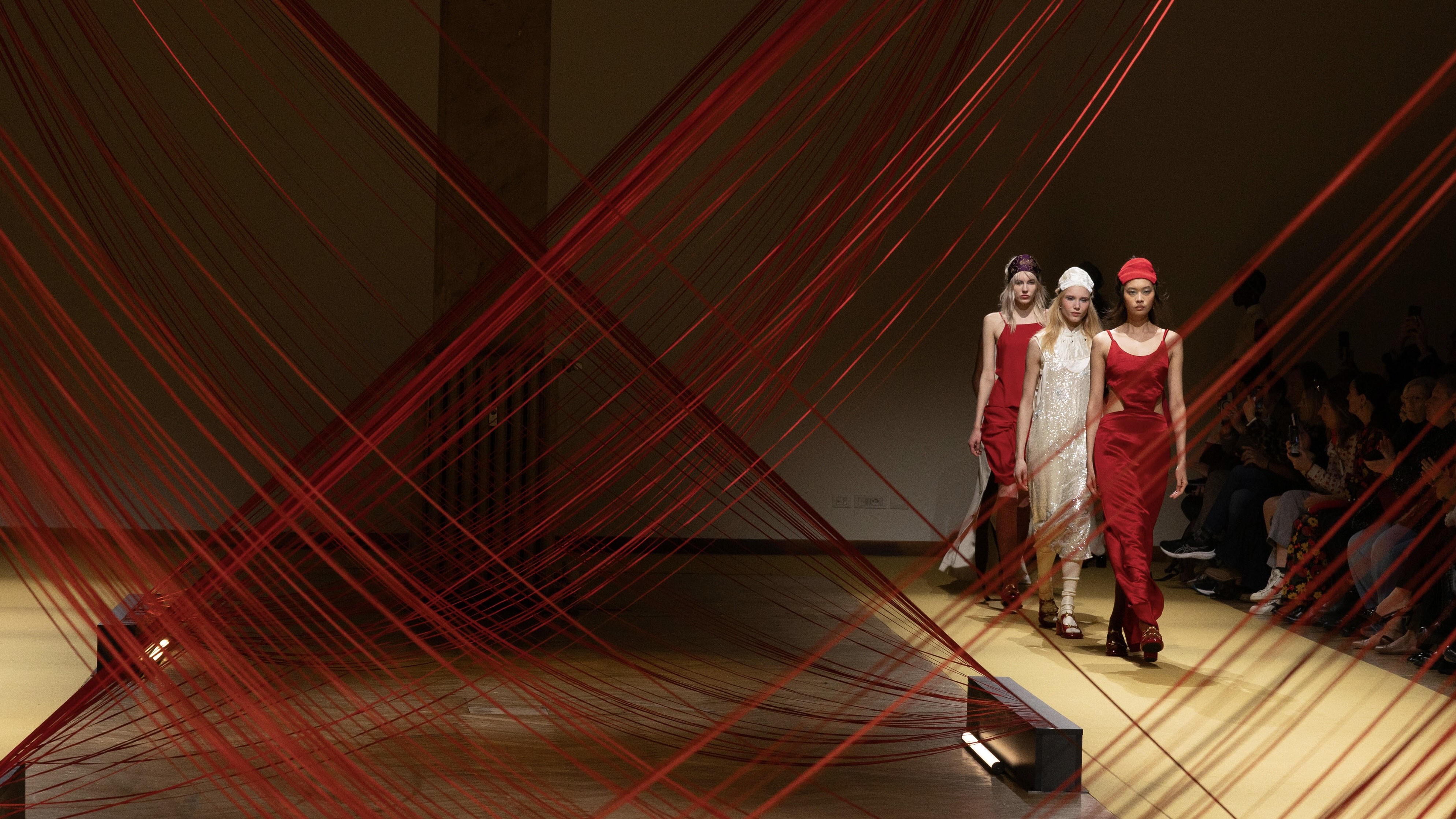本次秀場被打造為一段沉浸式的象徵性空間景觀。懸垂的絲線從天而降,構成一道道似斷似連的屏障,模特穿行其中,如同經歷女性生命的不同階段:從純真到承受,從沉默到覺醒。這一空間結構隱喻了女性在時間與社會結構中不斷疊加的情感層次,光影交錯間,絲線從纖細柔軟逐漸演變為具有結構性的存在,回應着女性角色從歷史敘事的「隱形」走向當代社會的「不可忽視」。