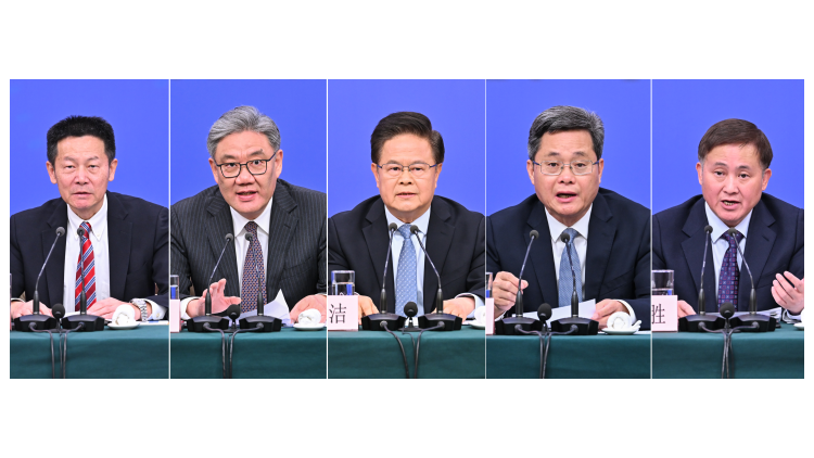 頂圖圖說:3月6日,十四屆全國人大四次會議在北京梅地亞中心新聞發布廳舉行記者會。國家發展和改革委員會主任鄭柵潔(中)、財政部部長藍佛安(右二)、商務部部長王文濤(左二)、中國人民銀行行長潘功勝(右一)、中國證券監督管理委員會主席吳清(左一)就發展改革、財政預算、商務、金融證券等相關問題回答中外記者提問(拼版照片)。(新華社)
