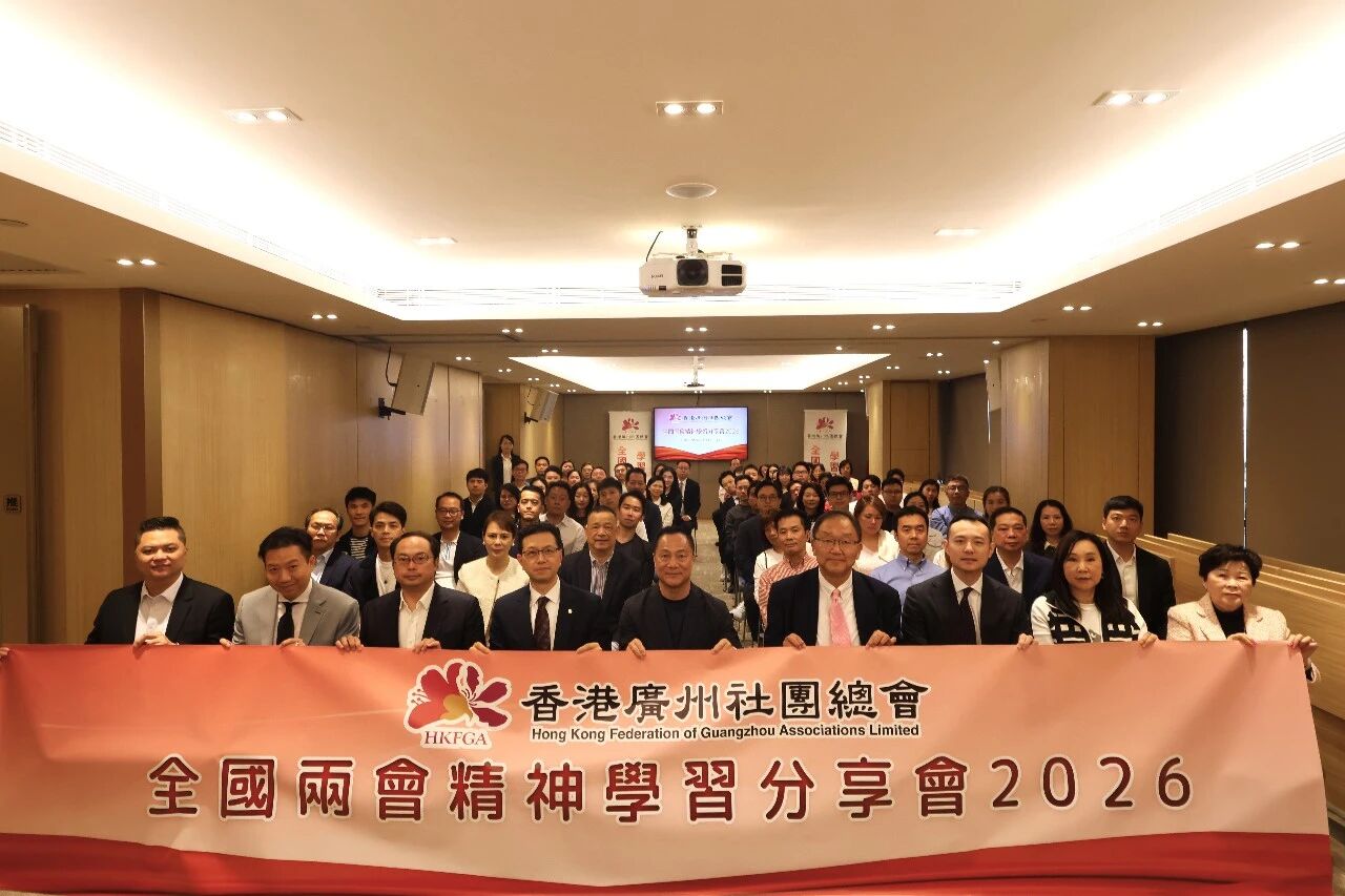 香港廣州社團總會於日前於總會會所舉辦「全國兩會精神學習分享會2026」,邀請了全國人大代表吳秋北、全國政協委員黃錦輝擔任主講嘉賓,為大家深入解讀中央政府工作報告及有關對港政策方針,分享兩會重要精神。香港廣州社團總會主席張廣軍、香港廣州社團總會執行主席方俊文、霍啟文、一眾常務副主席、十一區屬會首長代表、社團骨幹等百餘人出席學習分享會,常務副主席兼秘書長吳國雄擔任分享會主持人。