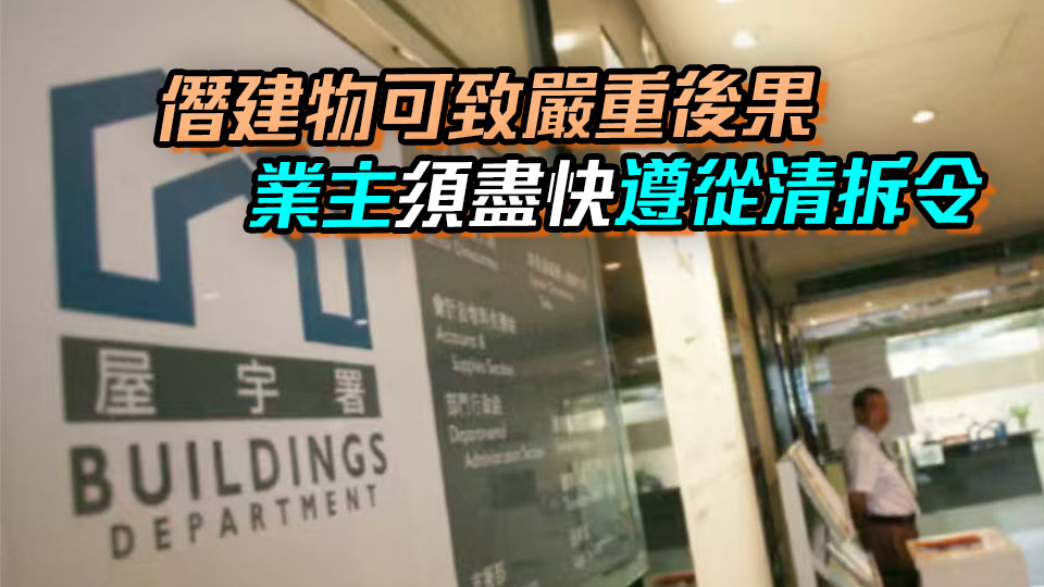 屋宇署發言人今日(23日)表示,僭建物可導致嚴重後果,業主必須盡快遵從清拆令。對於未有遵從清拆令的業主,屋宇署會繼續採取執法行動,包括提出檢控,以保障樓宇及公眾安全。
