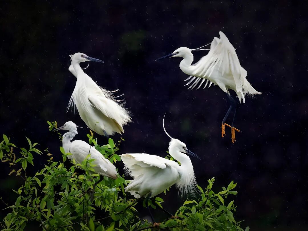 清晨的閶江,雨霧如輕紗籠罩水面。一群白鷺率先打破寧靜,它們舒展着潔白羽翼,在雨幕中上下翻飛,時而結伴追逐,翅膀拍打出細碎水花;時而停駐樹梢,用尖喙梳理被雨打濕的羽毛;最引人注目的是捕魚瞬間,白鷺們懸空盤旋鎖定目標,隨即如箭般紮入水中,出水時長喙已銜着掙紮的小魚,野性與靈動盡顯。