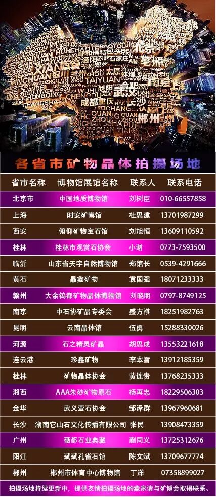 请部分没有拍摄条件的参赛选手,根据自己的位置,就近自行联系或寻找附近的矿晶藏家或博物馆负责人,双方协商约拍,因场地以及矿晶都是由收藏友情协助,参赛选手需要自行解决行程的各项费用,并严格遵守各拍摄场所的规定,谢谢您的参与。