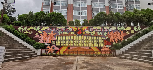 沿着雲南大理州南澗彝族自治縣民族中學的台階拾級而上,兩旁的橄欖樹枝上掛滿了青翠欲滴的果子,與校園中呈現的民族團結進步的視覺形象符號相互呼應、相得益彰,一派融合奮進的景象。