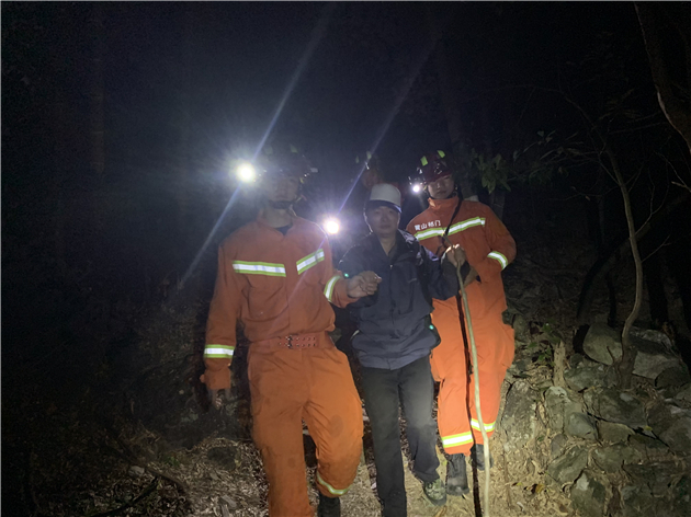 由於當時天黑、路滑、天冷,救援人員爬越了一個半小時的山路後,發現遊客包某之前發送的位置錯誤,遂又通過手機指導包某重新定位,從而確定了準確方位。重新定位後,第一批次救援隊再次翻越山脊,沿著陡峭的山路爬到山頂,於17日淩晨3時左右在一處石壁下找到了被困的包某。喜訊傳到指揮部,立即安排第二批次救援人員帶著水和食物前往接應,終於在天亮前將被困遊客安全救助下山。