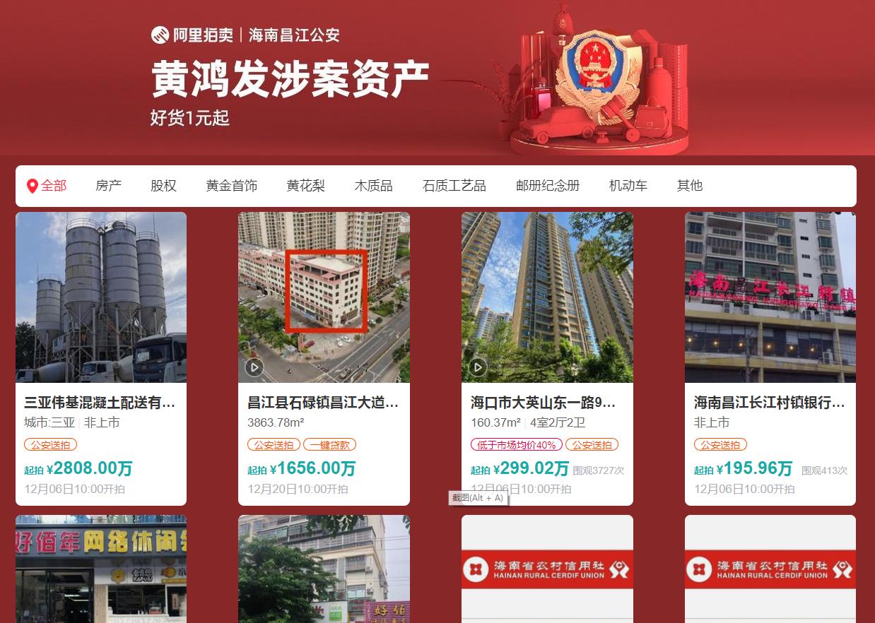 打開淘寶APP進入阿裏拍賣平臺,搜索“昌江縣公安局”即可進入昌江公安網路拍賣專場。專場內設有股權、房產、黃花梨、黃金首飾等標的物類別。12月5日至12月20日,該批涉黑資產將陸續正式開拍,其中,股權類標的物8個,評估價5598.83萬元,上拍價3282.04萬元;房產類標的物12個,評估價3235.53萬元,上拍價2232.40萬元;黃金首飾標的物210個,評估價332.87萬元,上拍價282.93萬元;海南黃花梨標的物40個,評估價129.91萬元,上拍價97.43萬元;郵冊紀念冊類標的物11個,評估價12.27萬元,上拍價9.2萬元;汽車、傢俱、工藝品、古銀幣、名牌包等其他類標的物52個,評估價82.47萬元,上拍價59.04萬元。