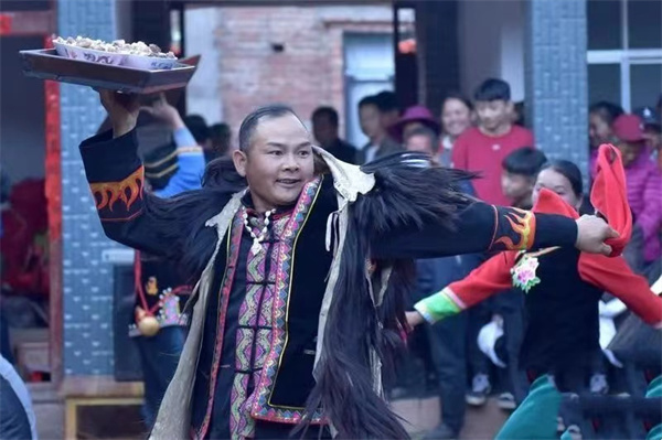 「哪裏好玩哪裏克,哪裏好在在哪裏,啊蘇噻呢甩着……」伴隨着豪放而婉轉的歌聲,幾個如虎般壯實的漢子,身披羊皮褂,頭頂托盤,雙手或捧着蘆笙或端着款待賓客的佳餚,和着音樂、踏着節拍盡情地表演,這是雲南省大理州南澗縣日常生活中最常看到的歡快舞蹈。
