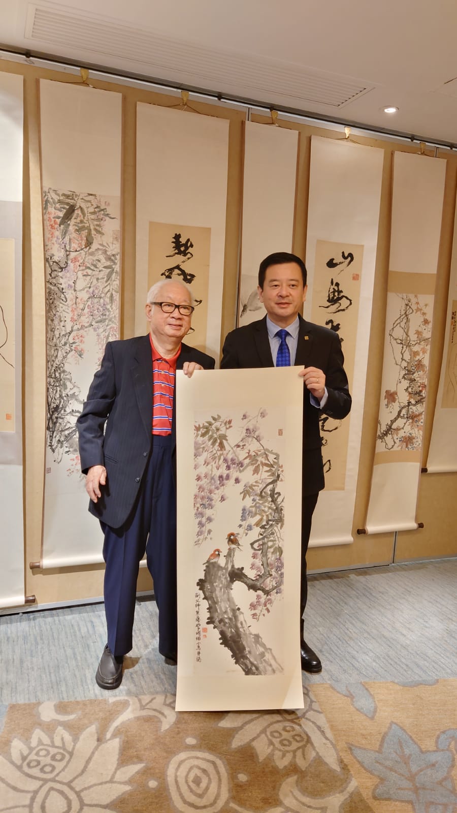 黎明(左)贈他與恩師高劍父合作繪畫的《紫藤雙雀》予香港理工大學,副校長楊立偉(右)代表學校接受捐贈。