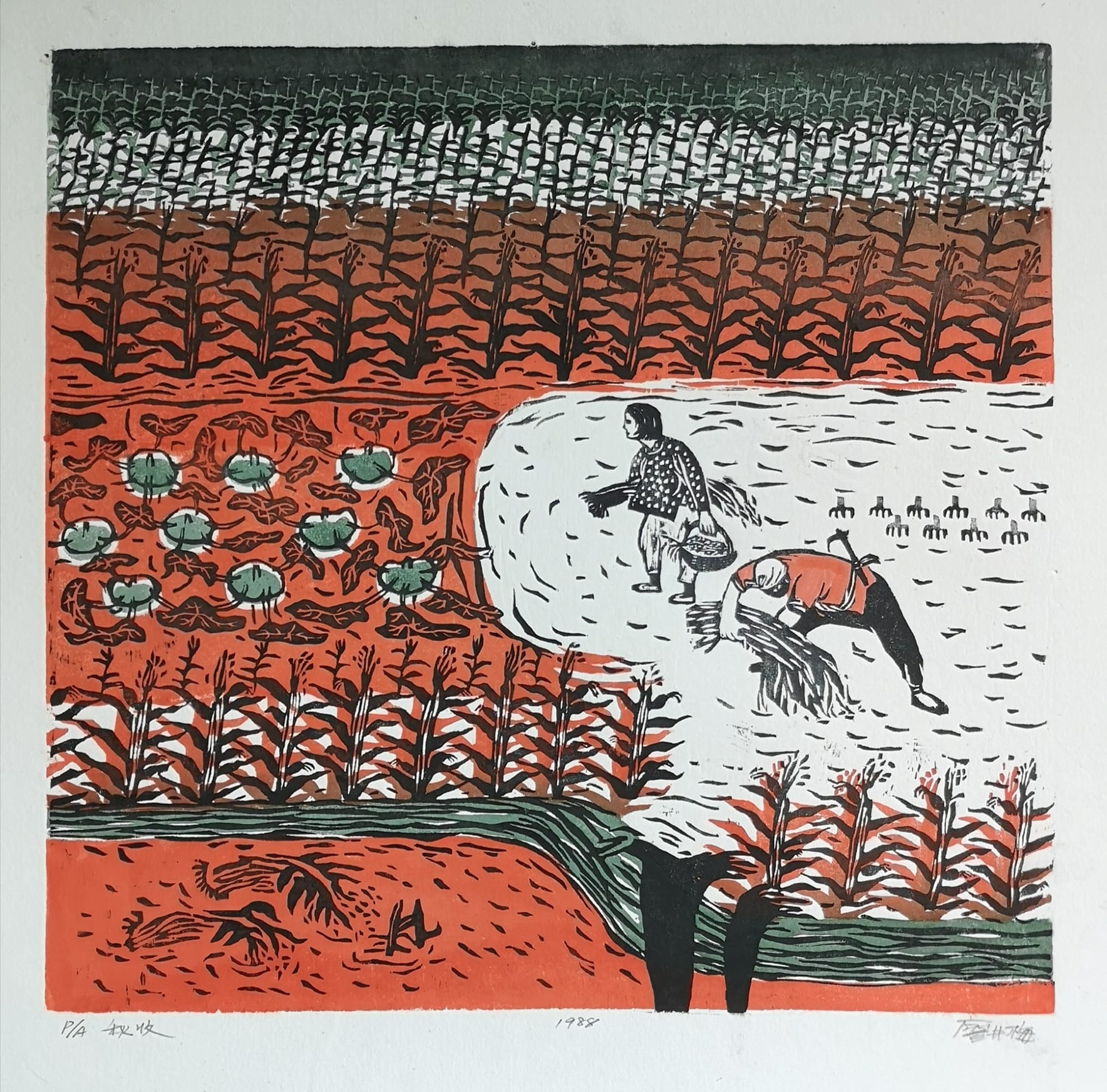 廖井梅木版水印作品《陝北人家——秋收》,1988年。