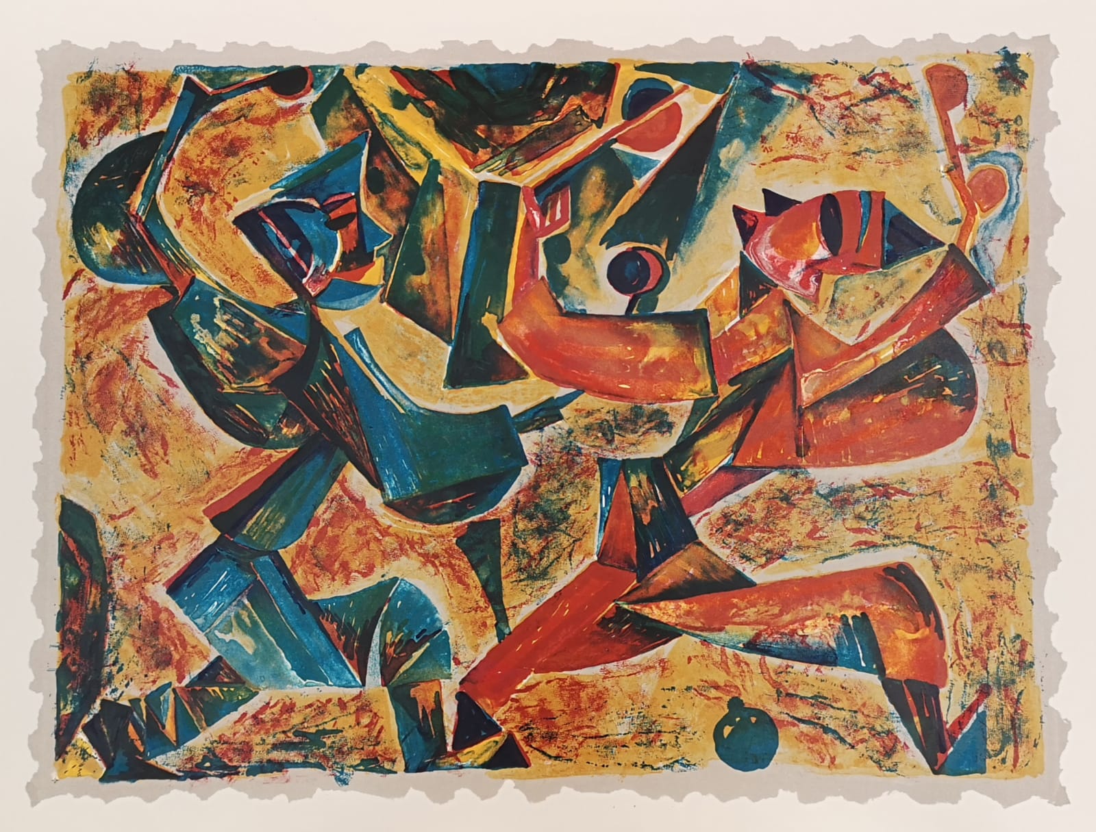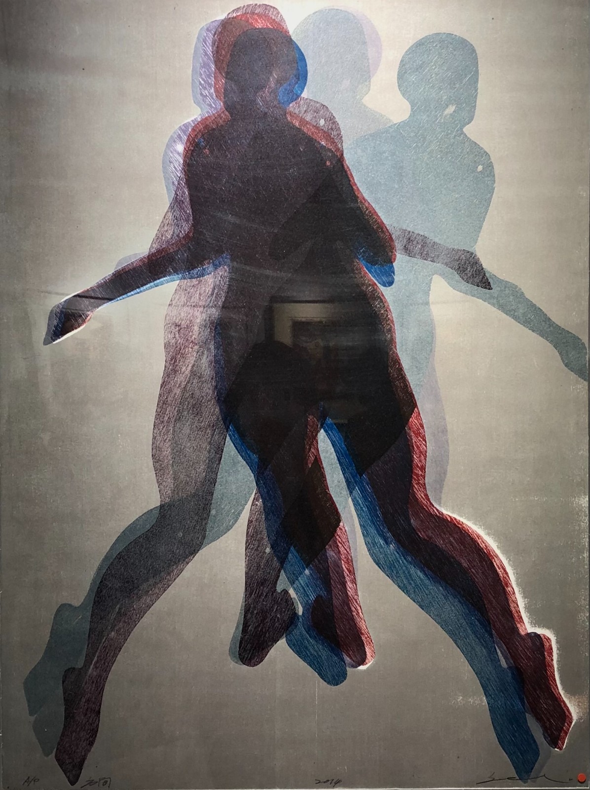 廖井梅石版作品「戲劇組畫」系列之一,1996年。該系列的舞樂和激戰被香港藝術館收藏。