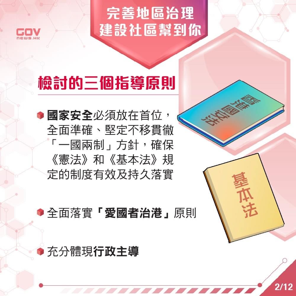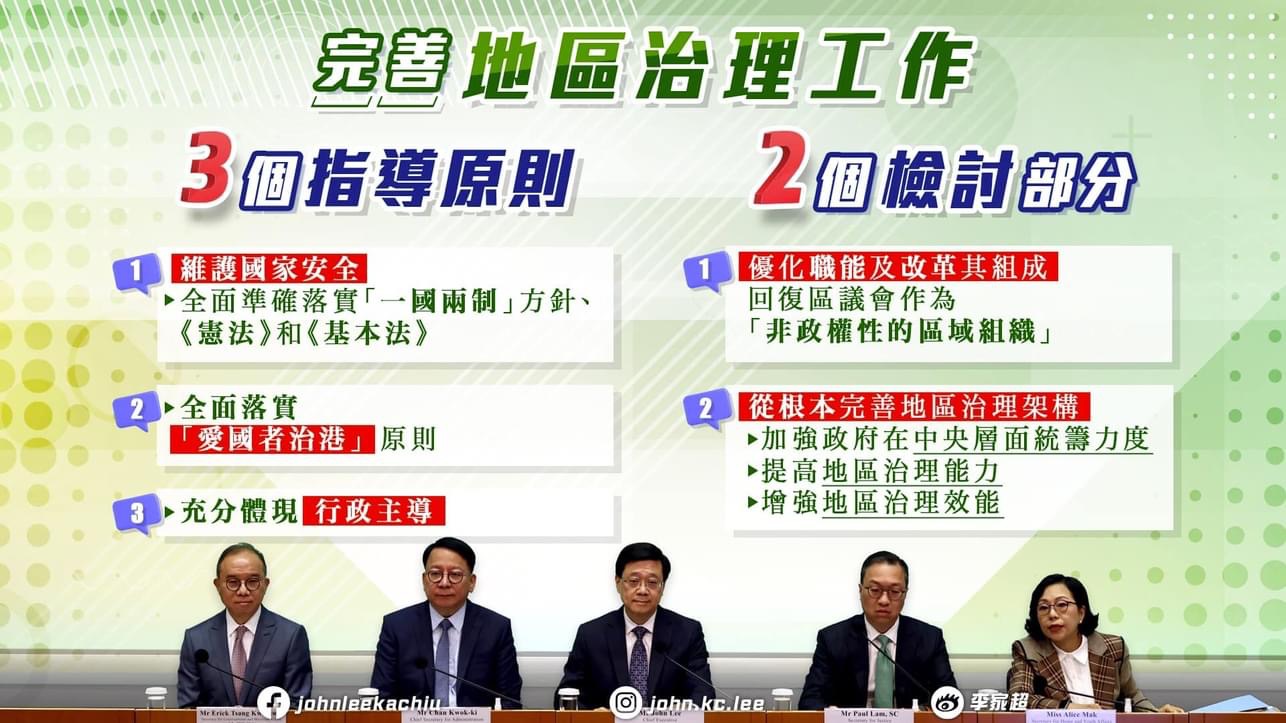 李家超續指,完善地區治理方案有三個原則:第一,國安必須放在首位,全面準確、堅定不移貫徹「一國兩制」方針,確保《憲法》和《基本法》規定的制度有效及持久落實;第二,全面落實「愛國者治港」原則;第三,充分體現行政主導。
