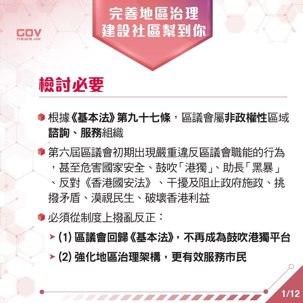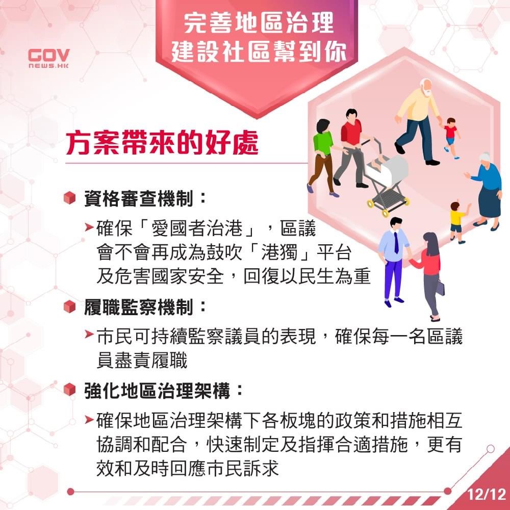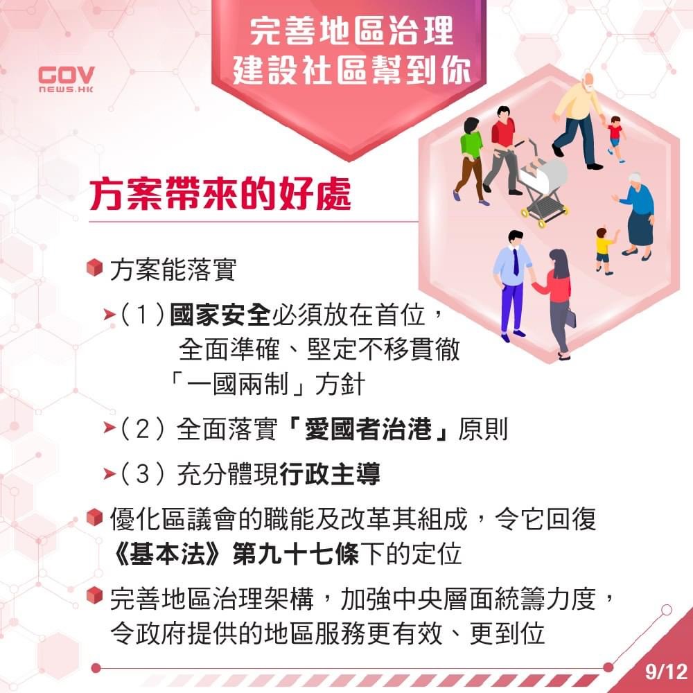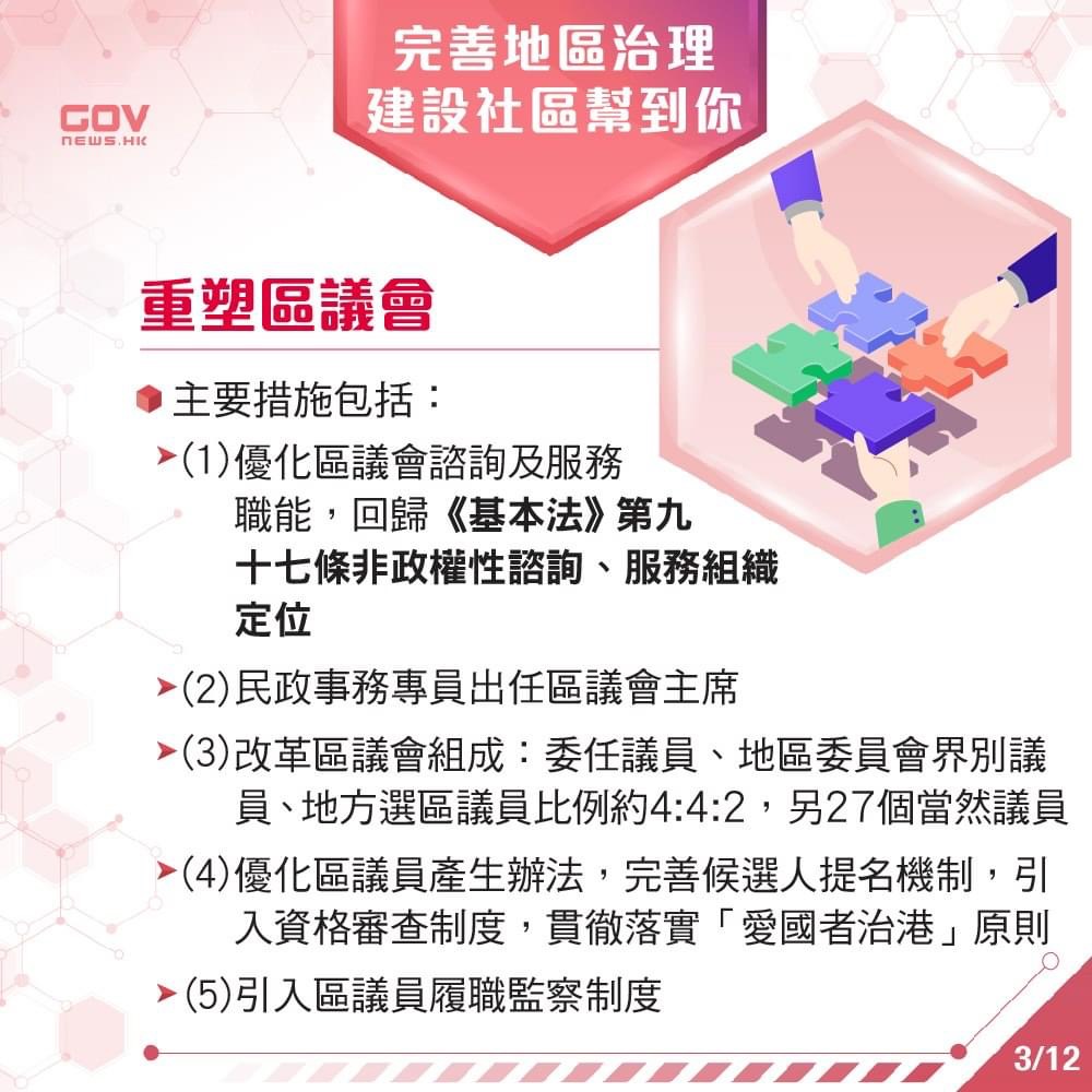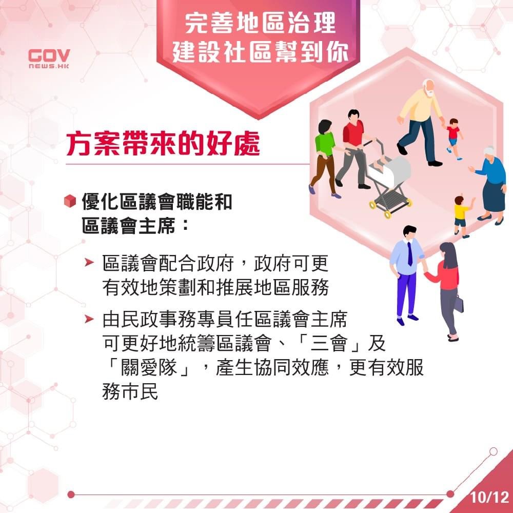 李家超說,完善地區治理主要分兩部分,一是優化職能及改革其組成,回復區議會作為「非政權性的區域組織」;二是從根本完善地區治理機構,加強政府在中央層面的統籌力度,提高地區治理能力,增強地區治理效能。