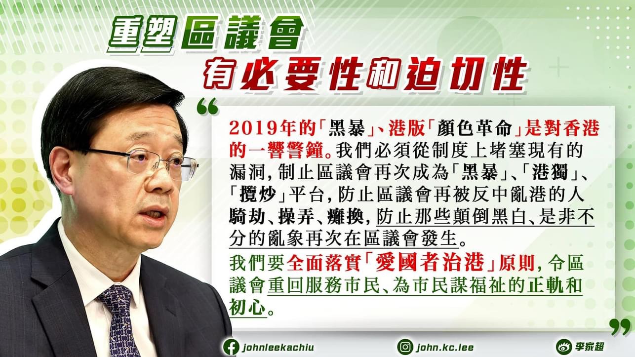 李家超表示,2019年「黑暴」、港版「顏色革命」是對香港的一響警鐘。必須從制度上堵塞現有的漏洞,制止區議會再次成為「黑暴」「港獨」「攬炒」平台,防止區議會再被反中亂港的人騎劫、操弄、癱換,防止那些顛倒黑白、是非不分的亂象再次在區議會發生。要全面落實「愛國者治港」原則,令區議會重回服務市民、為市民謀福祉的正軌和初心。