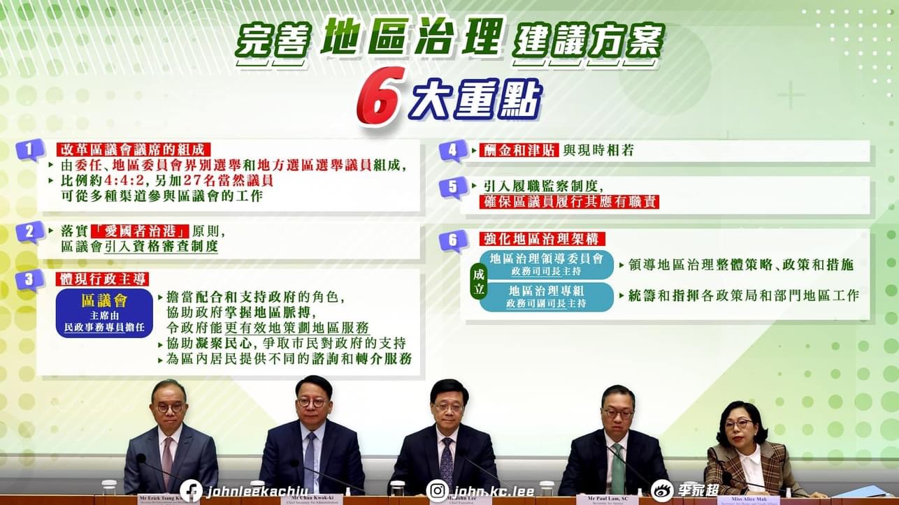行政長官李家超今日(2日)下午3時30分就完善地區治理建議方案舉行記者會,政務司司長陳國基、律政司司長林定國資深大律師、政制及內地事務局局長曾國衞,以及民政及青年事務局局長麥美娟出席。根據區議會改革方案,第七屆區議會議員總數為470人,由委任、地區委員會界別選舉以及地方選區選舉議員組成,議員數目比例約為4:4:2,另加27名當然議員;區議會主席則由民政事務專員擔任。
