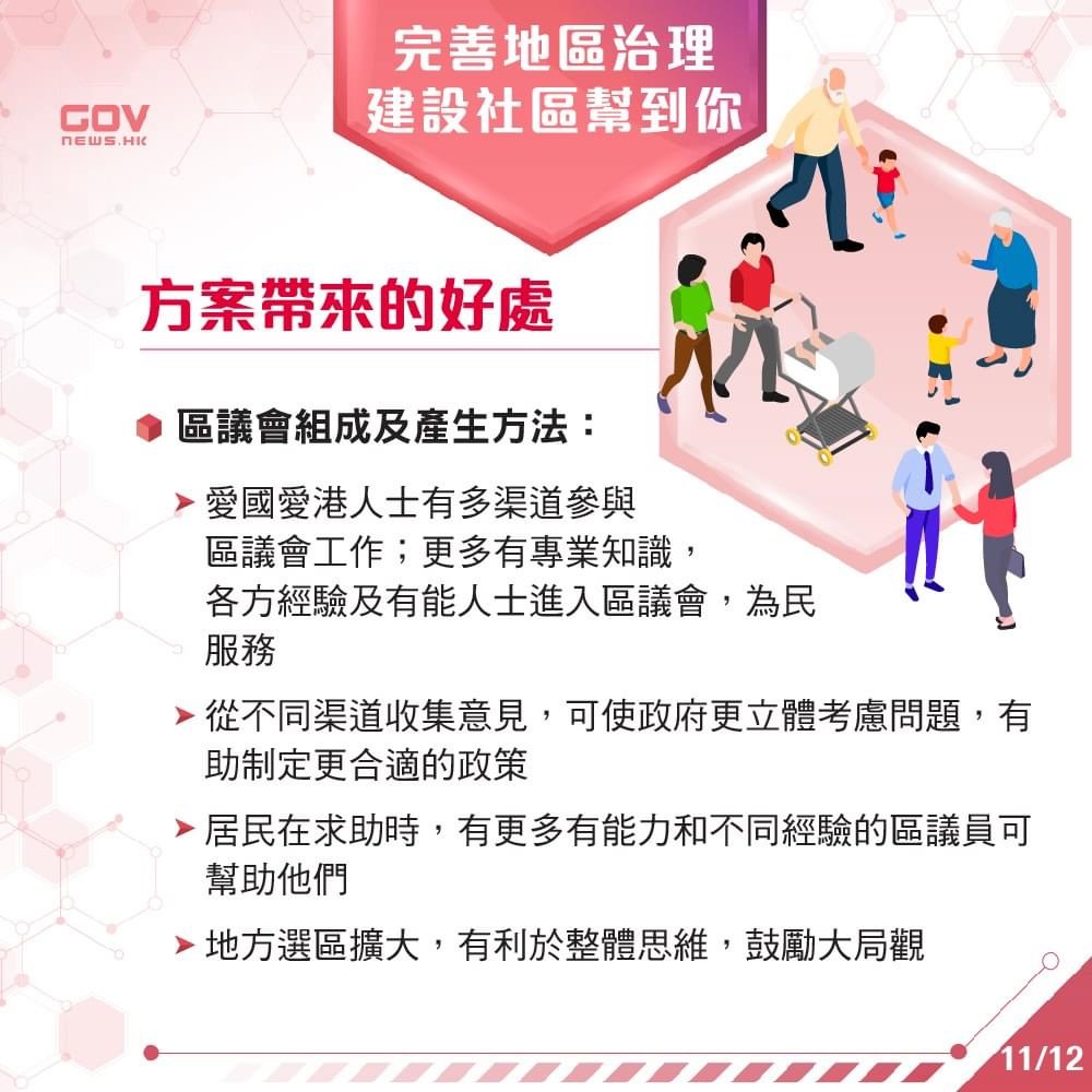 民政及青年事務局局長麥美娟表示,由多種方式產生的區議員令愛國愛港、有志服務地區人士透過多渠道參與區議會工作。而透過不同渠道收集市民意見,可令政府更立體考慮問題,有助制定更合適政策。居民尋求區議員協助時,目前只是局限於地方選區區議員,日後可向不分選區的委任制或地區委員會界別議員求助,將有更多人幫助市民。