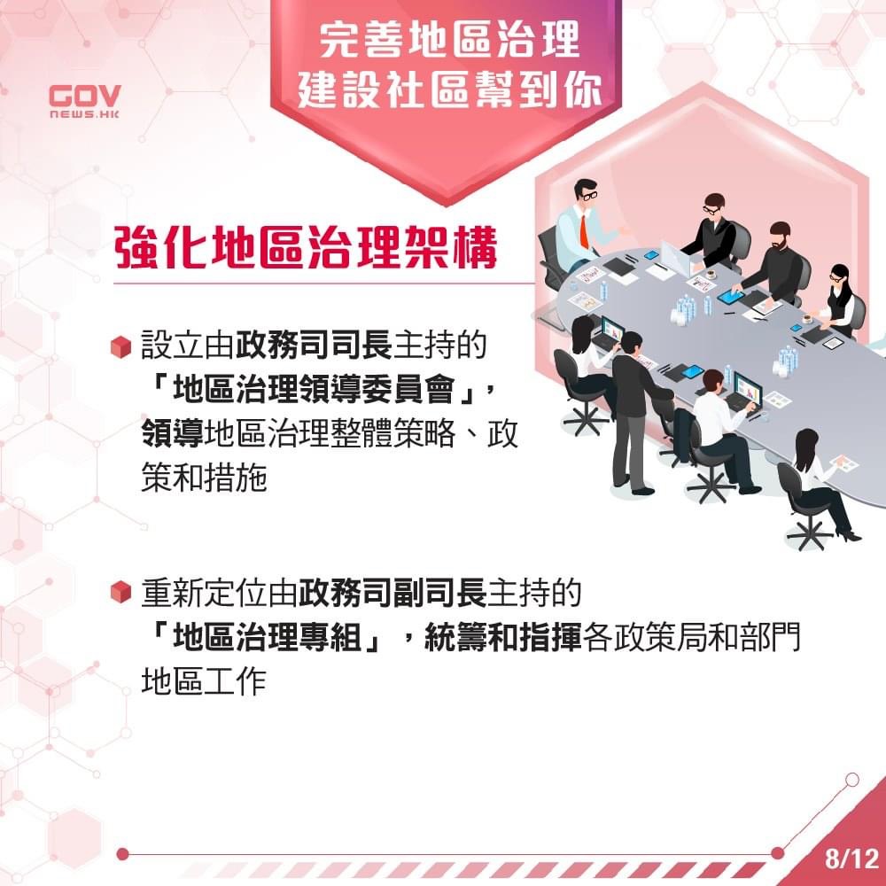 另外,政府將成立「地區治理領導委員會」,由政務司司長主持,同時成立「地區治理專組」,由政務司副司長主持。陳國基說,兩者預計在年中成立及舉行首次會議,「地區治理專組」將根據「地區治理領導委員會」定下的策略方針,指揮及統籌相關政策局及部門,制定相應的地區治理政策和措施。