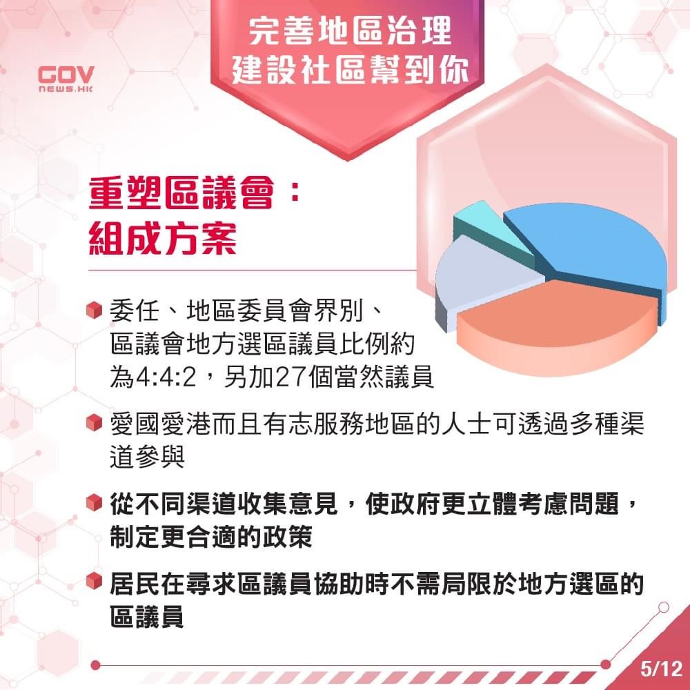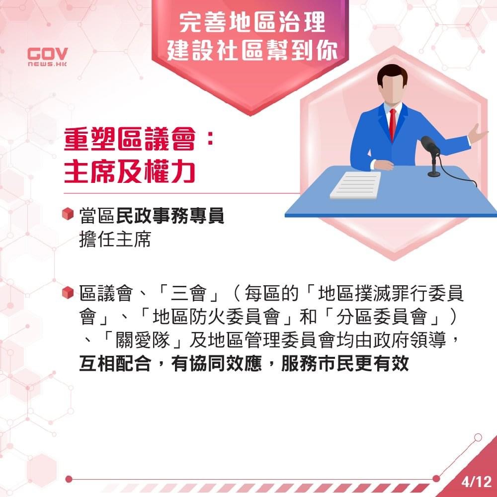 她又說,日後區議會主席由當區民政事務專員擔任,將更好發揮領導和協調作用,區議會主席獲賦權制定會議常規、委任委員會、委任區議員擔任委員會主席、委任非區議員擔任委員會增選委員,以體現行政主導,確保配合政府施政。