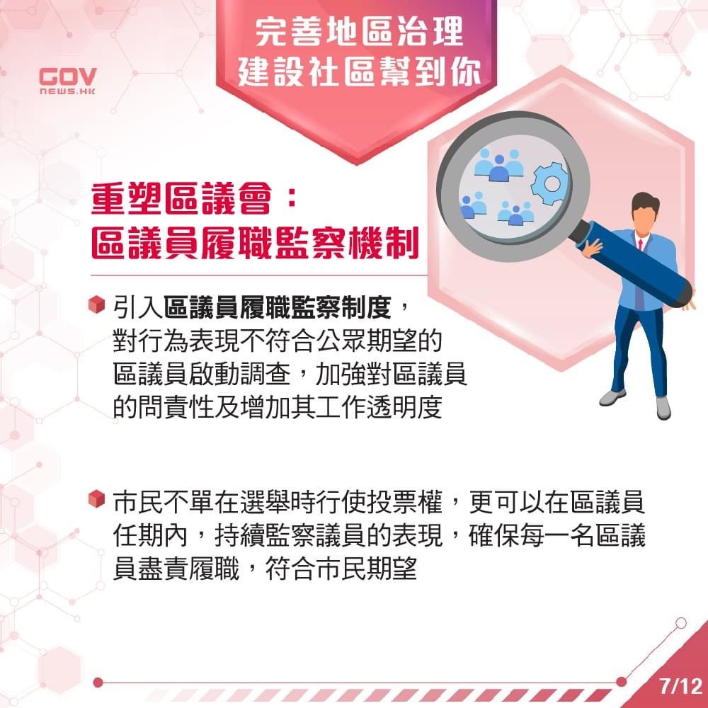 政府又會引入「區議員履職監察制度」,確保區議員履行應有職責,包括對行為表現不符合公眾期望的區議員進行調查,以及根據嚴重程度進行合適處理。