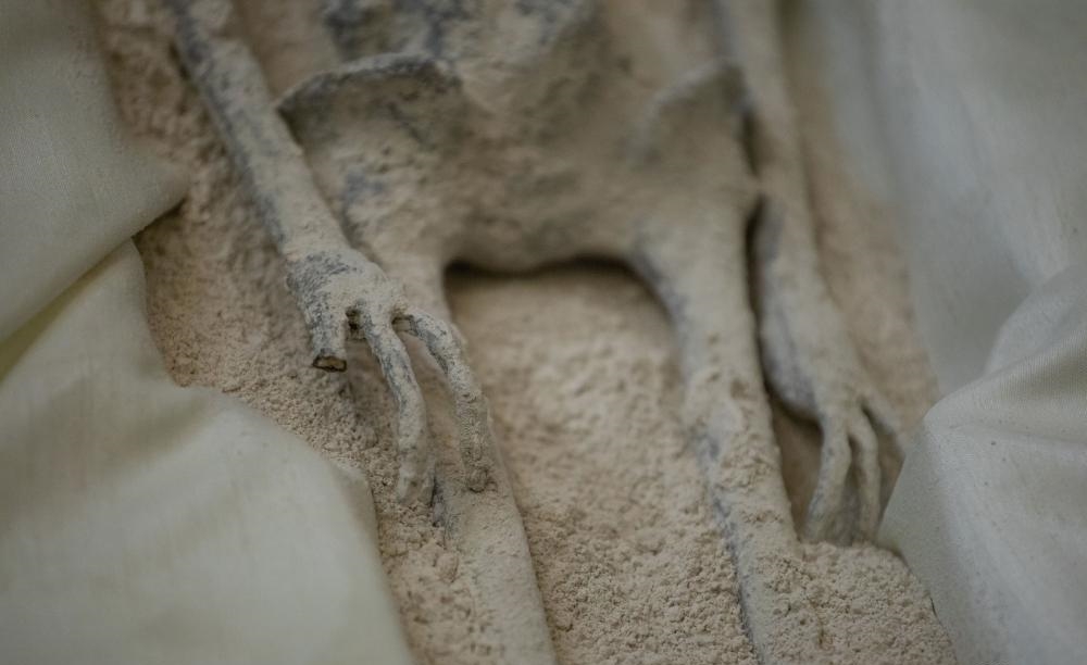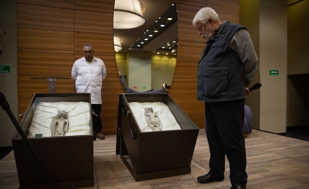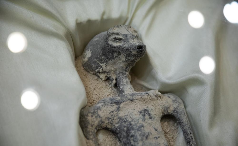 在當天的聽證會上,墨西哥議會對外展出了兩具疑似「外星生物」的遺骸。這兩具遺骸於2017年在秘魯被發現,距今分別有1800年和700年。遺骸的頭部細長,每隻手有3根手指。從遺骸中提取的DNA也顯示,它們並非人類。