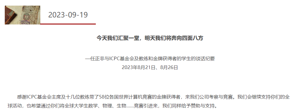 9月19日,ICPC(國際大學生程序設計競賽)北京總部官網發布了《今天我們匯聚一堂,明天我們將奔向四面八方——任正非與ICPC基金會及教練和金牌獲得者的學生的談話紀要》(下稱「《紀要》」)。