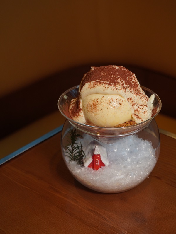 餐單最後以甜點「屋」作結,海鹽奶蓋提拉米蘇以雪球形狀呈現,配以雪地中的小木屋裝飾,小巧可愛。
