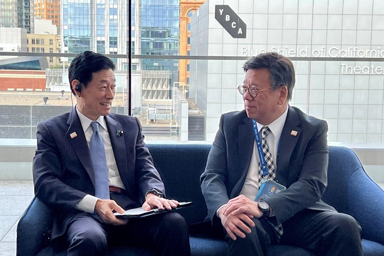 商務及經濟發展局局長丘應樺(右)在美國三藩市出席第三十四屆亞太區經濟合作組織部長級會議期間,與日本經濟產業大臣西村康稔(左)會面,就雙方關注的議題交流意見。