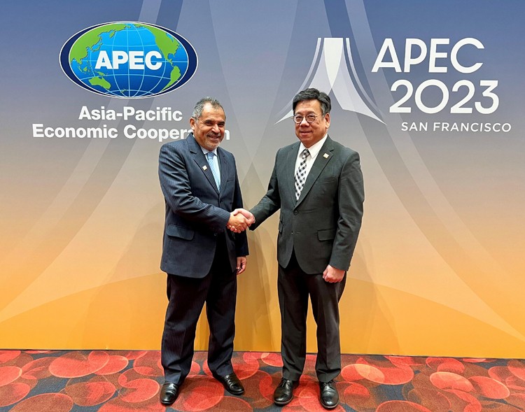 商務及經濟發展局局長丘應樺(右)在美國三藩市出席第三十四屆亞太區經濟合作組織部長級會議期間,與秘魯外貿和旅遊部長Juan Carlos Mathews Salazar(左)舉行雙邊會議,討論多項經貿議題。