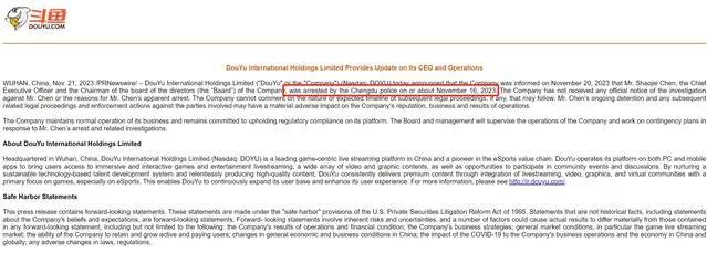 11月21日,斗魚發布公告稱,公司CEO陳少傑先生於2023年11月16日左右被成都警方逮捕。公司尚未收到任何有關對陳先生進行調查或陳先生明顯被捕的原因的正式通知。陳先生的持續拘留以及隨後針對相關當事人的任何相關法律訴訟和強制執行行動可能會對公司的聲譽、業務和經營業績產生重大不利影響。