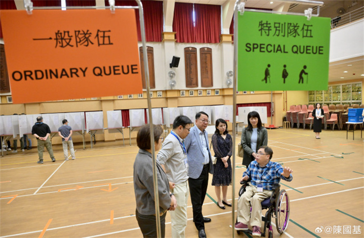 12月9日,據@陳國基微博發布,政務司司長陳國基表示,明天就是1210區議會選舉日的大日子!為了確保各票站運作萬無一失,政府今天舉行大型演練行動,陳國基和政制及內地事務局常任秘書長傅小慧下午一起到位於皇仁書院的票站,視察演練的情況,也為票站同事打打氣。