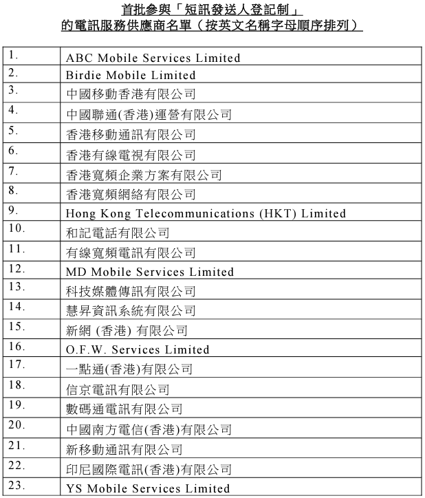 根據登記制,「已獲認證的發送人」會使用以「#」號開頭的「已登記的短訊發送人名稱」發出短訊予本地流動服務用戶。登記制會首先涵蓋電訊業,市民可透過通訊辦網站(www.ofca.gov.hk/ssrs)查閱首批參與登記制的電訊服務供應商名單(下表)。
