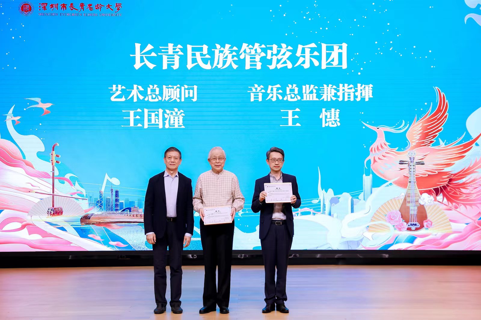 深圳長青民族管弦樂團今月初宣布成立,委任國寶級二胡演奏家王國潼為藝術總顧問,以及香港二胡藝術中心主席王憓為音樂總監兼指揮。深圳市政協原主席、市長青老齡大學校長戴北方於「灣區樂齡」民樂交流活動頒獎暨長青民族管弦樂團成立專場音樂會上為兩位藝術家頒發了聘書。