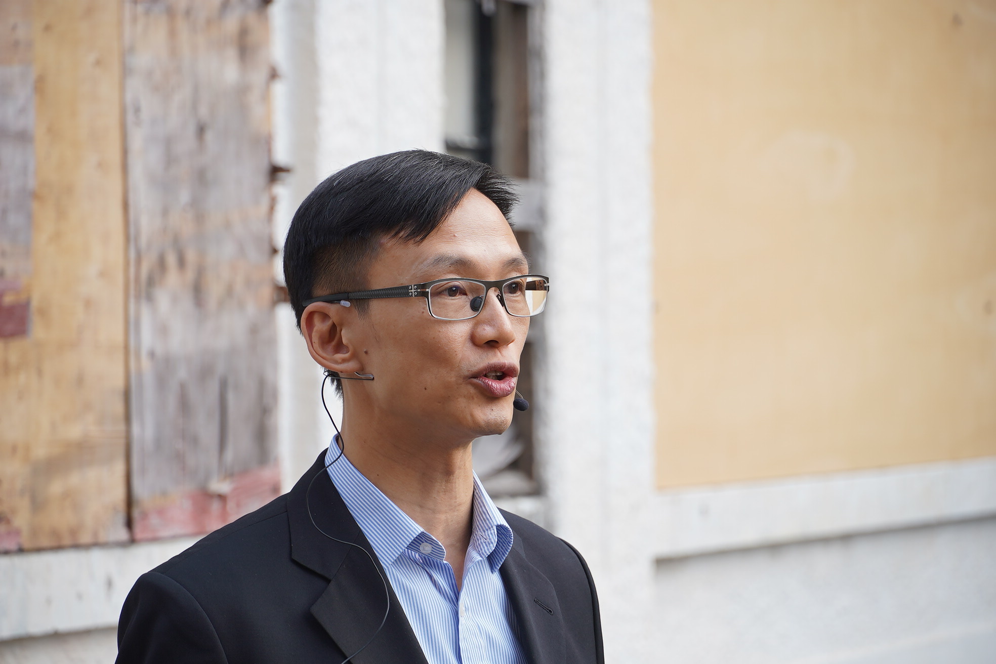 文物保育專員蔣志豪介紹前哥頓軍營Watervale House。(記者馮俊文攝)