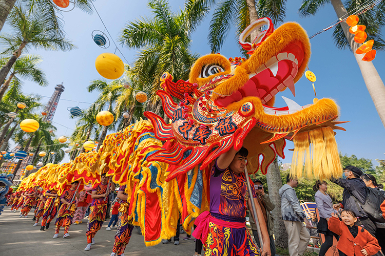 在景區前廣場,福龍迎春,醒獅賀歲,讓遊客感受濃郁的新年韻味。走進世界之窗,財神送福,驚喜連連,哪吒、月老、小龍女、豬八戒、魔法師、花仙子等東西方神話人物的NPC齊聚,與遊客歡樂互動,趣味橫生的新春快閃,文化底蘊深厚的舞龍舞獅,傳統民俗在新年氛圍中熠熠生輝……環球舞台五大洲新春萬人狂歡大巡遊、艾菲爾鐵塔下電音狂歡、遍布園區的世界風情演藝、連續九天的凱旋門璀璨絢爛煙花,將世界潮流新風融入東方文化深厚底蘊,滿溢在園內的歡聲笑語,讓新年氛圍感頃刻拉滿。鏡頭下開心歡騰的遊人、濃墨重彩的喜慶「福」字、古風華服的小姐姐,都為新春佳節增添了一抹亮麗的色彩。一幕幕精彩表演,引得現場遊客拍手叫絕。