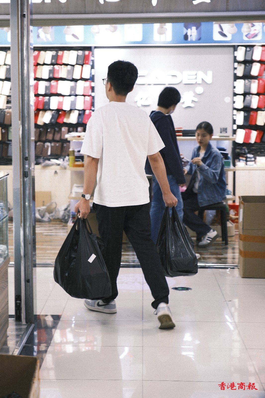 來自俄羅斯的謝爾蓋正在這裏採購各種款式的手機殼和耳機套,時而比劃手勢,時而在計算器上滴滴答答,和檔口店員進行着「無聲的議價」。這是謝爾蓋在深圳的第五天,按深圳口岸(落地)簽證的規定,他今晚就要回國了。和華強北的其他顧客一樣,他將採購好的貨品用黑色塑料袋簡單裝起,便匆匆走回附近的酒店。