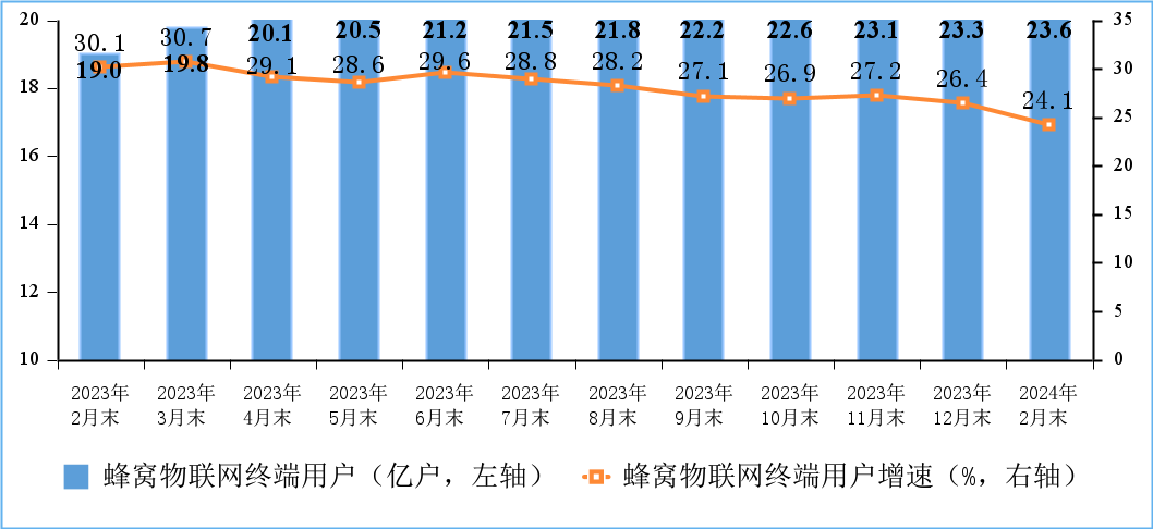 蜂窩物聯網用戶較快增長,IPTV(網絡電視)用戶穩步增加。截至2月末,三家基礎電信企業發展蜂窩物聯網終端用戶23.64億戶,比上年末淨增3199萬戶,佔移動網終端連接數(包括流動電話用戶和蜂窩物聯網終端用戶)的比重達57.5%。IPTV(網絡電視)總用戶數達4.05億戶,比上年末淨增424.6萬戶。