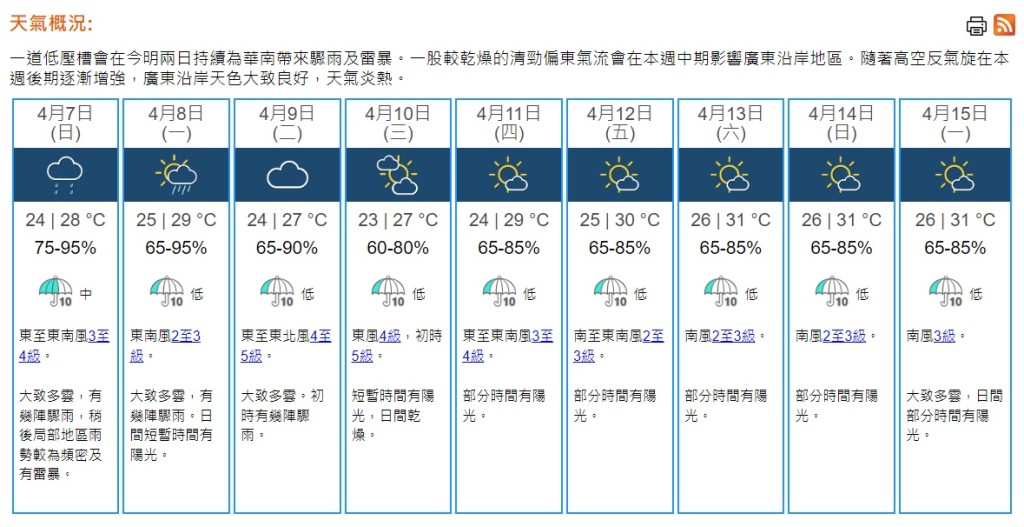 天文台今早(7日)表示,一道低壓槽正影響廣東。本港方面,早上短暫時間有陽光,日間最高氣溫約28度,今早新界部分地區錄得約10毫米雨量。此外,影響廣東沿岸的偏東氣流正逐漸緩和。
