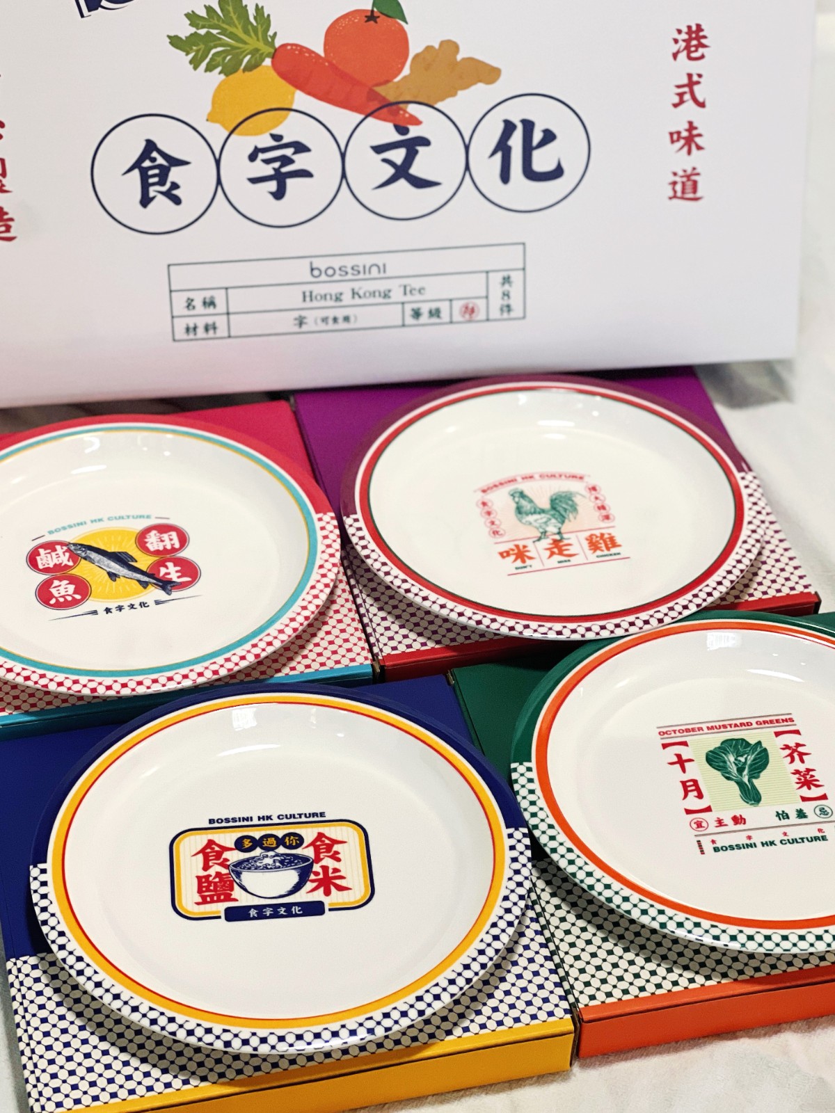 在「食字市集」購買T恤可免費獲贈限量版食字文化餐碟一隻。碟上設計有「十月芥菜」、「鹹魚翻生」、「咪走雞」、「食鹽多過你食米」等廣東俗語。