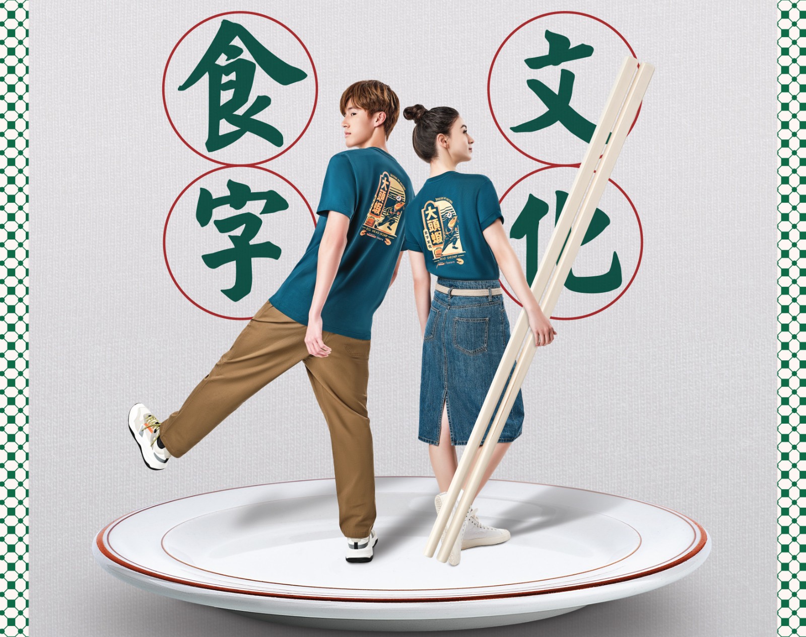 蟹、檸檬、薑等除是食物的代表,在廣東話中還有其他含義。「食字文化系列T恤」以幽默搞笑的插畫印花、設計型格撞色的衣服呈現8句廣東話俗語。如「扮晒蟹」有假扮,以假示人的意思,主要形容無實力但過度吹噓自己的人,畫家以卡通人物於蟹群中做出蟹鉗、裝作蟹的模樣表現,趣味可愛;「夠薑」形容有勇氣、膽識過人,畫家筆下的薑戴住太陽眼鏡、不羈地駕駛電單車,玩味感十足;「食檸檬」用於被人冷漠拒絕,心裏酸溜溜,衣服上的卡通人物用拳頭阻擋檸檬攻擊,表達不想被人拒絕,十分趣怪;「呃我膝頭哥唔食辣椒醬」用來表達不會被謊言騙倒,圖案以強而有力的膝頭踢爆一罐辣椒醬,傳神又有趣。
