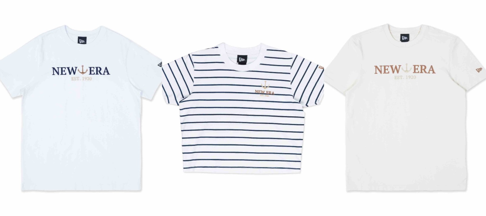 SAILOR CLUB系列備有三款以黑色、白色和奶白色為底色的 T 恤,胸前點綴船錨圖案和 NEW ERA 字樣,以及一款水手風格配色條紋T恤,更顯清涼感。