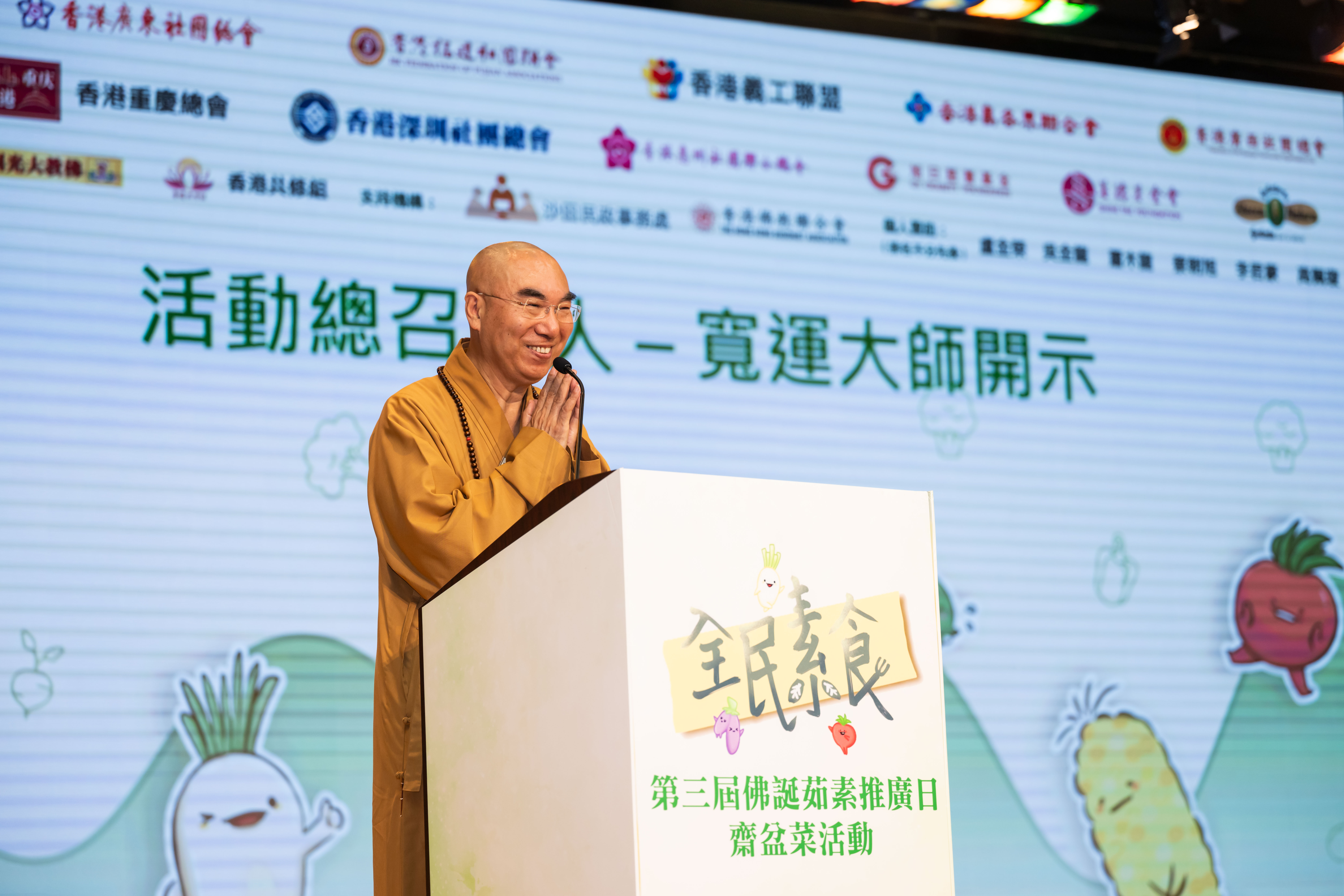 釋寬運提到,今天是釋迦牟尼佛誕辰2568年的紀念日,祝福大家佛誕吉祥。他表示,「茹素推廣日已經歷三屆,從撒種到開花,今年已經結果,今天是全港茹素推廣日,全民素食齊響應,活動十分有意義。」他表示,一切眾生皆有如來智慧德相,所以提倡戒殺、茹素、放生。他表示,素食習俗歷史悠久,人體也適宜素食生活,希望大家積極參與佛誕茹素活動。