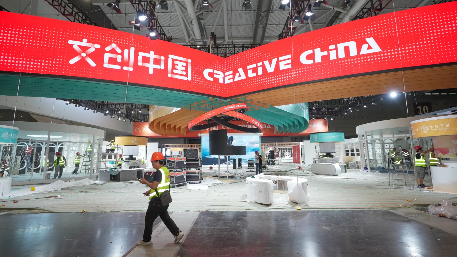 首次設立的「文創中國」專題展區,是今年文博會的重頭戲之一。記者前去探營時,正看到工作人員小心翼翼吊起兩塊大型的曲面屏。負責搭建落地的李煒告訴記者,為了讓展區內的參展商可以有充足的時間布展,呈現更好的效果,搭建團隊正在飛速趕工。李煒表示,從第一屆文博會開始,他就參與了文博會一些展區的搭建,20年來,他的事業和文博會息息相關。在他眼中,文博會20年發展,科技水平越來越高,對搭建的要求也越來越高。這次能參與到「文創中國」展區的搭建,他感到又欣喜又有壓力,「每天只睡三四個小時,希望能將這個展區完美呈現出來。也給自己20年文博之路留下一個紀念。」