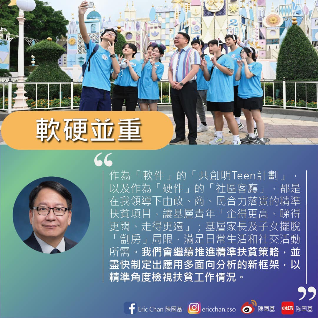 第三是「軟硬並重」,陳國基先從「軟件」說起,「共創明Teen計劃」首2期已扶持約6800基層青年,第一期共約2800名學員都在預設的八大評估指標有所進步,並已悉數加入「校友會」。至於「硬件」方面,他表示陸續推出至少4個「社區客廳」,讓過千戶基層家長及子女擺脫「劏房」局限,善用「客廳」設施滿足日常活動所需;同時為近3000名基層學童提供課後託管服務。他表示,政府會繼續推進各樣精準扶貧項目,按需要適時優化,並盡快制定出應用多面向分析的新框架,以精準角度檢視扶貧工作情況。