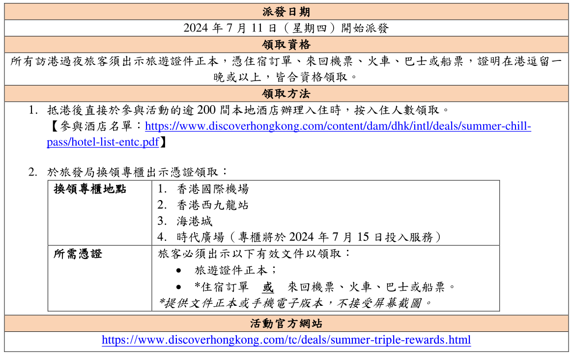旅發局即日起免費派發予訪港過夜旅客50萬份「夏日三重禮」。(旅發局圖片)