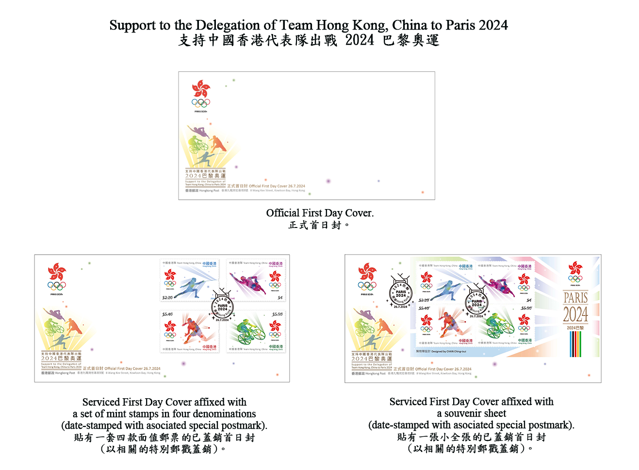 香港郵政以「支持中國香港代表隊出戰2024巴黎奧運」為題發行一套四枚郵票及相關集郵品,展示中國香港代表隊曾獲獎牌的奧運項目,包括劍擊、游泳、乒乓球及單車,向香港運動員致以崇高的敬意,祝願他們在巴黎奧運勇創佳績,為國家和香港爭光。