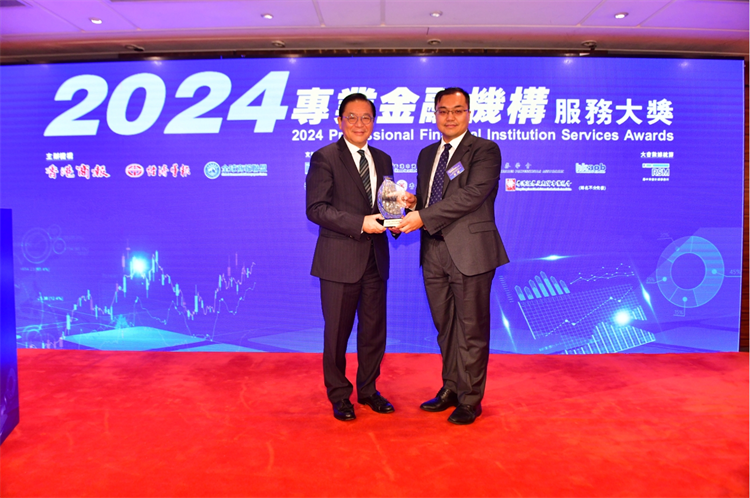 行政會議成員林健鋒(左)頒粵港澳大灣區金融服務大獎予中銀國際證券代表李超。