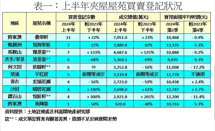 利嘉閣地產研究部主管陳海潮表示,發展商自全面撤辣後積極推出新盤應市,肆意吸納市場購買力;另一邊廂,房委會於上半年期內先後放寬居屋擔保期及批出「白居二」准買證,銳意加快舊居屋流轉。在一手私宅與未補價居屋聯手夾擊下,夾屋市場表現未如理想,登記量拾級而下。根據土地註冊處最新資料顯示,今年上半年夾屋買賣錄55宗登記,較去年下半年的60宗減少8%,連跌兩期;期內登記總值錄3.43億元,較上期的3.97億元同步下跌約14%,登記量及總值均創近11期(即5年半)新低。