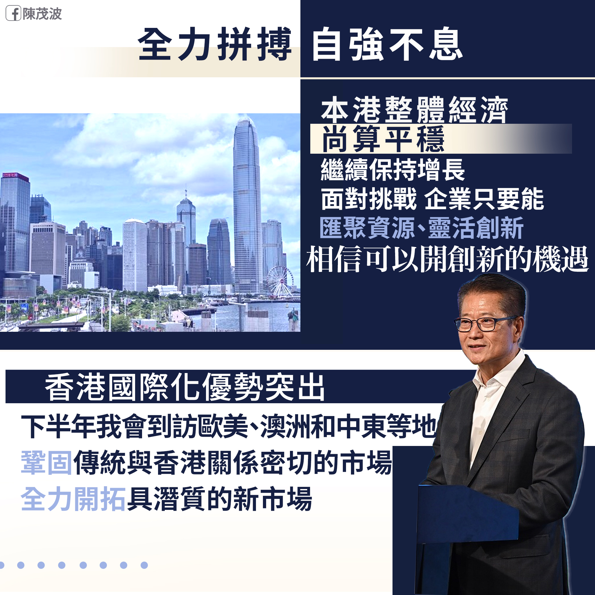 陳茂波表示,行政長官上周率團訪問東盟三國,擴闊了我們的朋友圈、開拓了更多商機。特區政府團隊相關官員往後會繼續積極外訪,下半年我會到訪歐美、澳洲和中東等地。這些外訪,一方面鞏固傳統與香港關係密切的市場的投資者和資金,同時也全力開拓具潛質的新市場、新資金來源。事實上,在金融、商務、文化和人文交流等多方面,香港的國際化優勢突出,與不同地方有廣泛的商務和人脈關係,一直以來在國際經貿中角色獨特,在不同風浪中保持強大韌力。我們要好好發揮這優勢和功能,不斷為國家作出貢獻、為自己取得更好發展。
